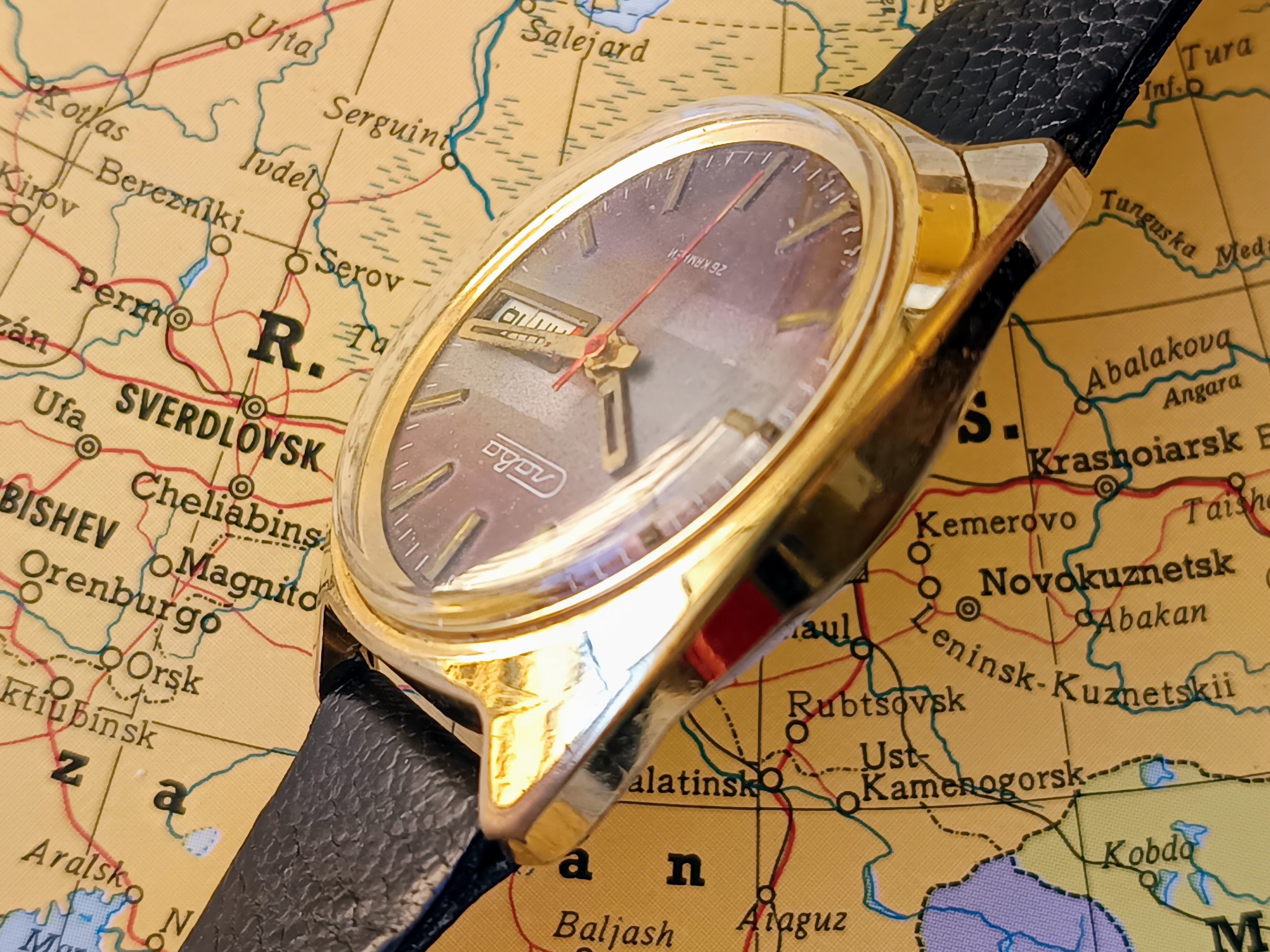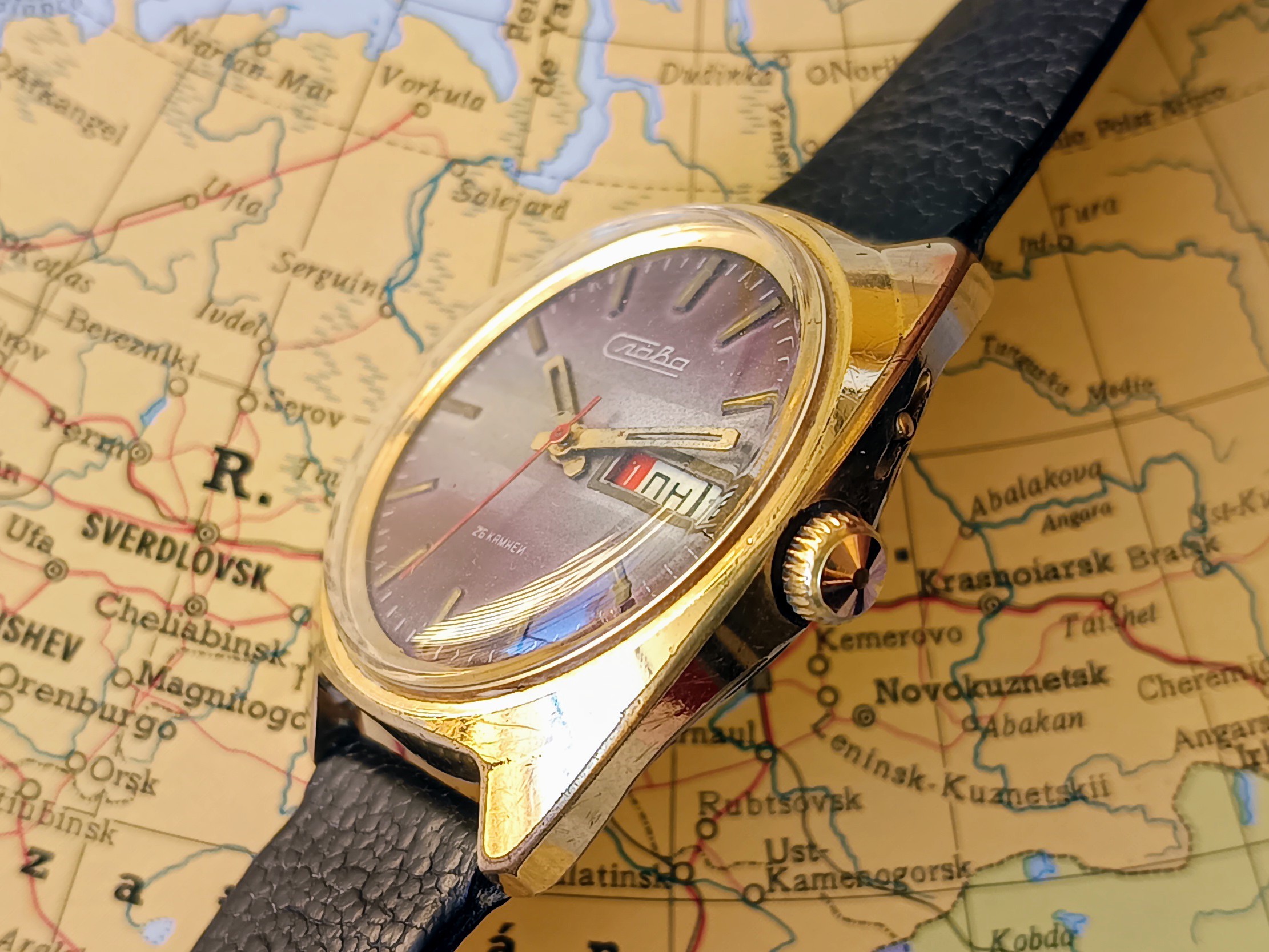 Complicaciones: Día (en cirílico) y fecha con cambio rápido mediante pulsador a las 2 h